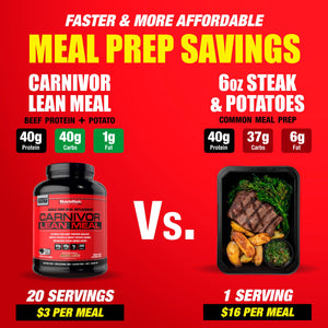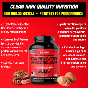 CARNIVOR LEAN MEAL es un sustituto de comida rápido, delicioso y nutritivo que energiza tu cuerpo y te ayuda a desarrollar y mantener masa muscular magra. Elaborada con ingredientes de alimentos integrales reales, esta fórmula ultralimpia incluye aislado de proteína de res CARNIVOR con papas blancas y boniatos, para proporcionar fuentes de proteínas y carbohidratos de la más alta calidad. CARNIVOR LEAN MEAL tiene 340 calorías ricas en nutrientes con 40 g de proteína, 40 g de carbohidratos y 0-1 g de grasa, azúcar, lactosa y colesterol, para una alimentación más limpia y magra.